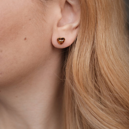Sterling silver gold plated earrings with natural amber "Cognac heart"