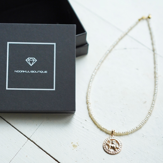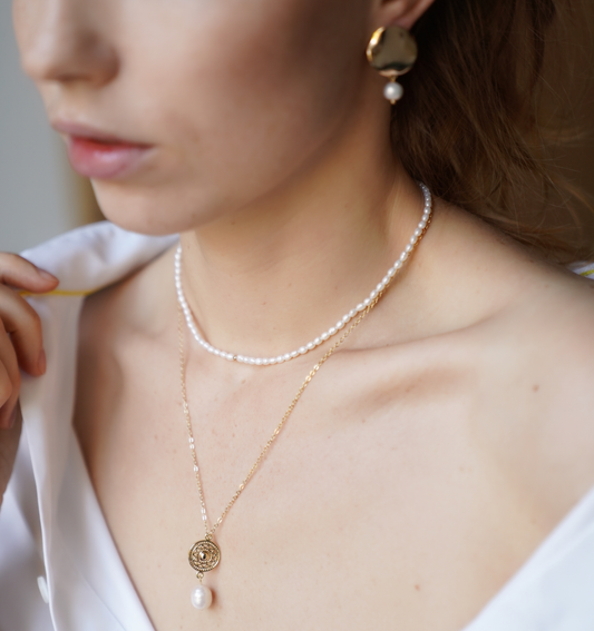Natūralių perlų vėrinys su auksu dengtomis detalėmis