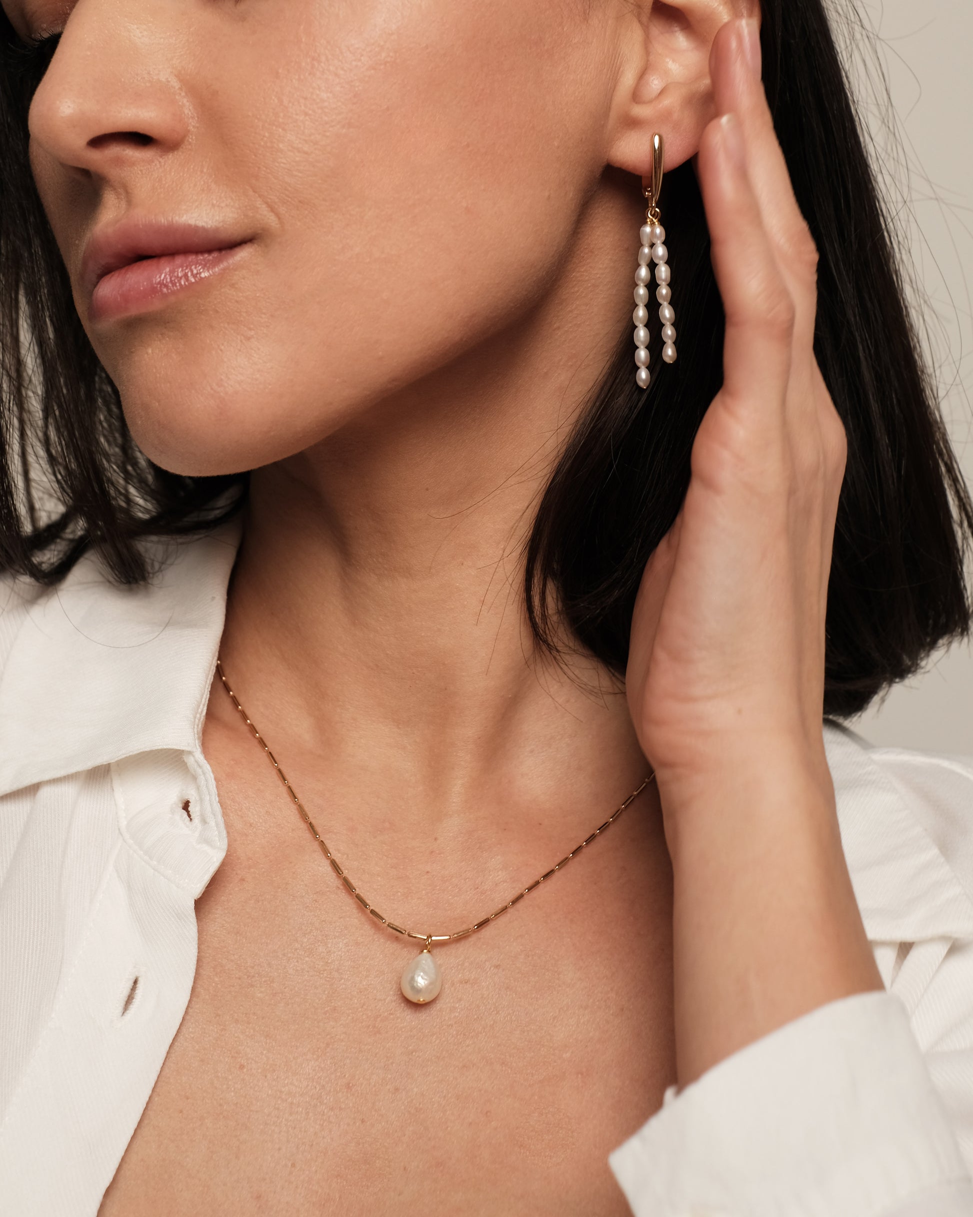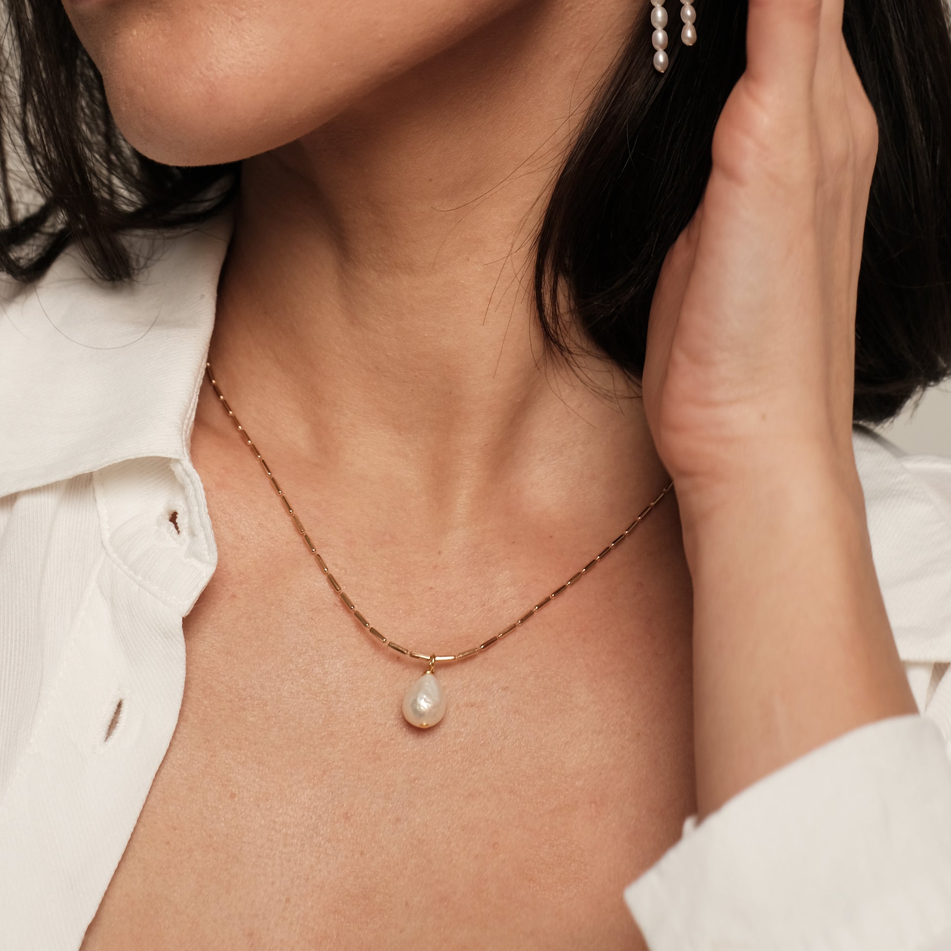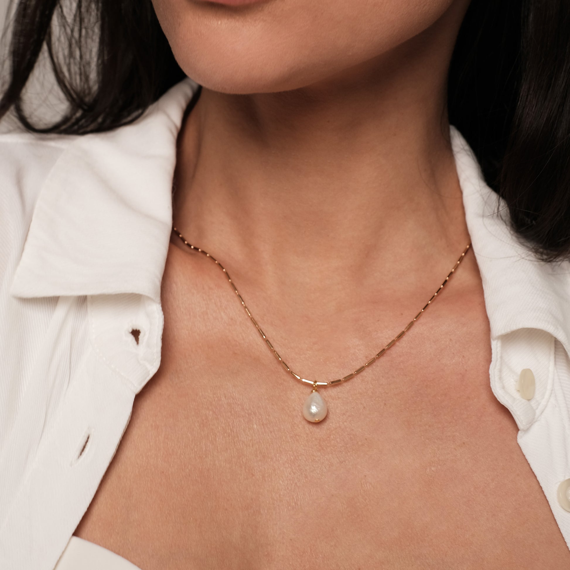 Apzeltīta kaklarota ar dabīgo pērli.